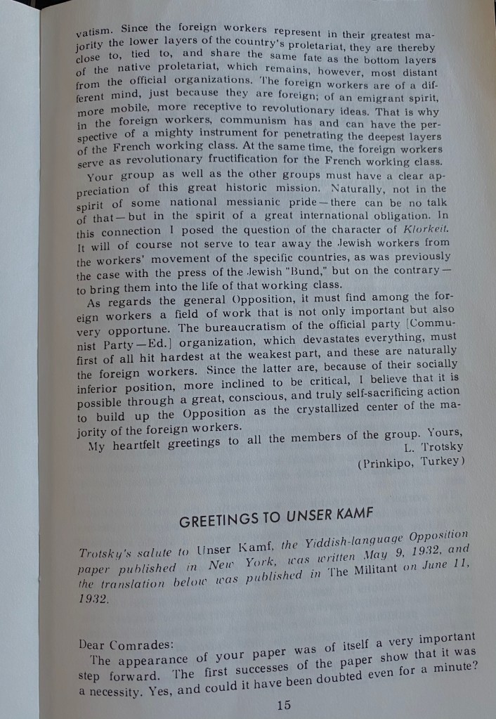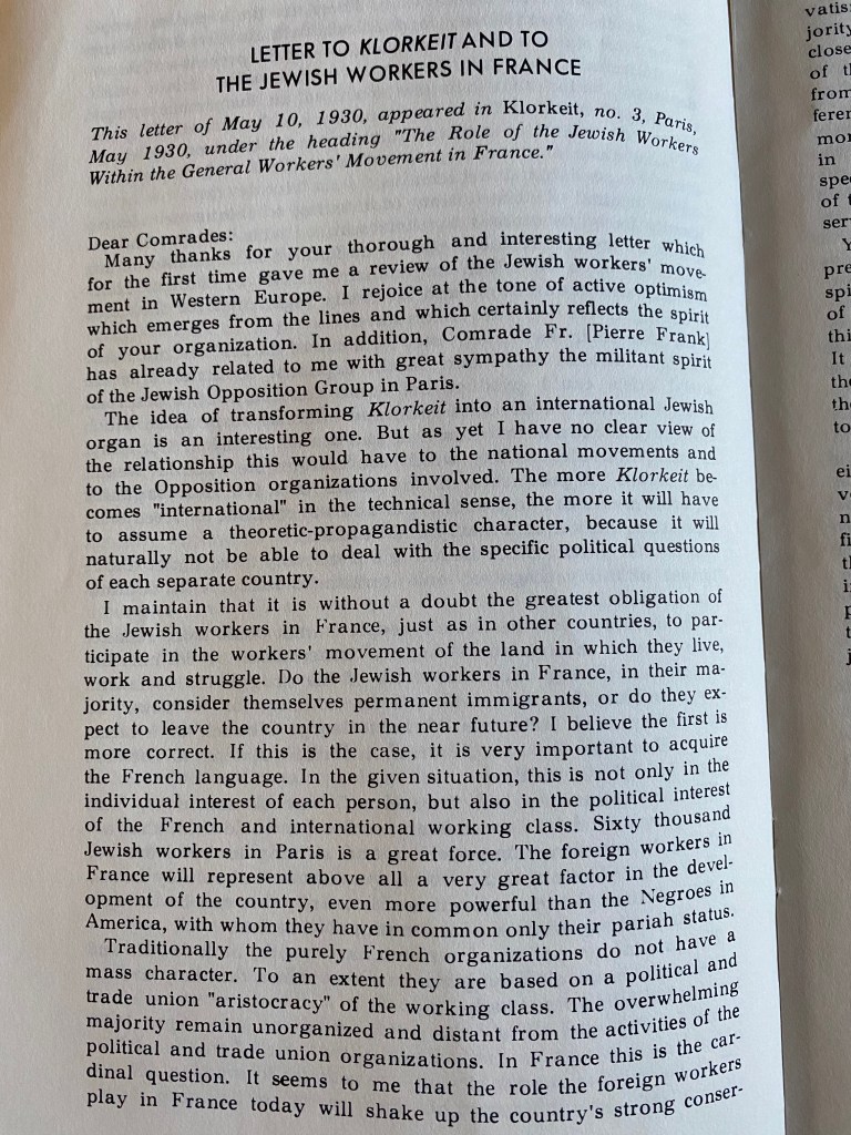 The pamphlet above contains letters from Trotsky to Jewish Marxists in France and the United States. Writing before the Holocaust, he urges Jewish workers to engage in the class struggle in their own countries. “Sixty thousand Jewish workers in Paris is a great force”, he noted. Regarding the US, Trotsky claimed: “The role of the foreign-born Jewish worker in the American proletarian revolution will be a very great one, and in some respects decisive.”