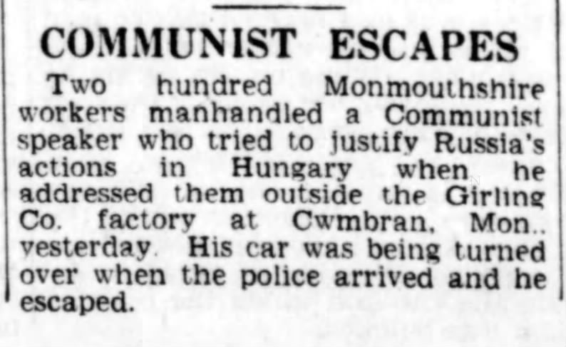 The Daily Telegraph reported on one Communist coming under attack from 200 workers in Monmouthshire, south-east Wales, as he “tried to justify Russia’s actions in Hungary”. Police arrived as his car was being turned over on to its back. Communists like this, with their unquestioning support for the Moscow line, were referred to as “tankies”, especially by Trotskyists on the European left.