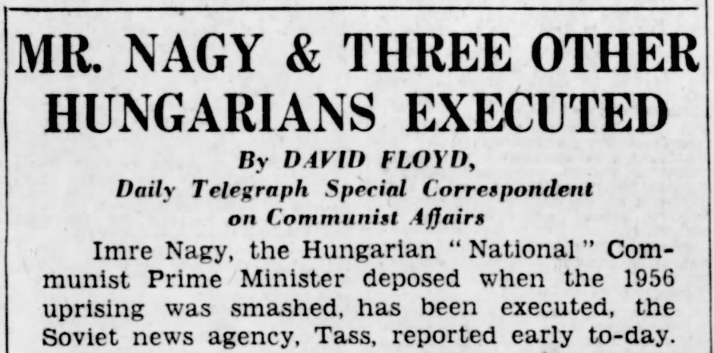 The Daily Herald, a British left-wing newspaper, denounced Russia in the strongest terms with a large rally held in London, organised by the Labour Party and trades unions, to express solidarity with the Hungarian people. The Guardian newspaper declared that Nagy’s death ended any hope among communists around the world that they could operate without Kremlin interference.
