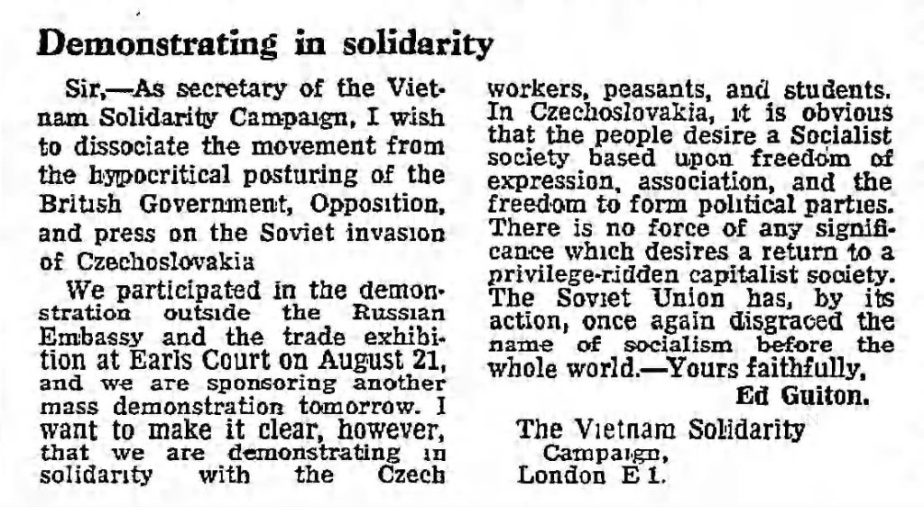 For example, the secretary of the Vietnam Solidarity campaign wished to emphasise that the Prague Spring’s objectives had not been capitalist restoration but a better form of socialism (see below).