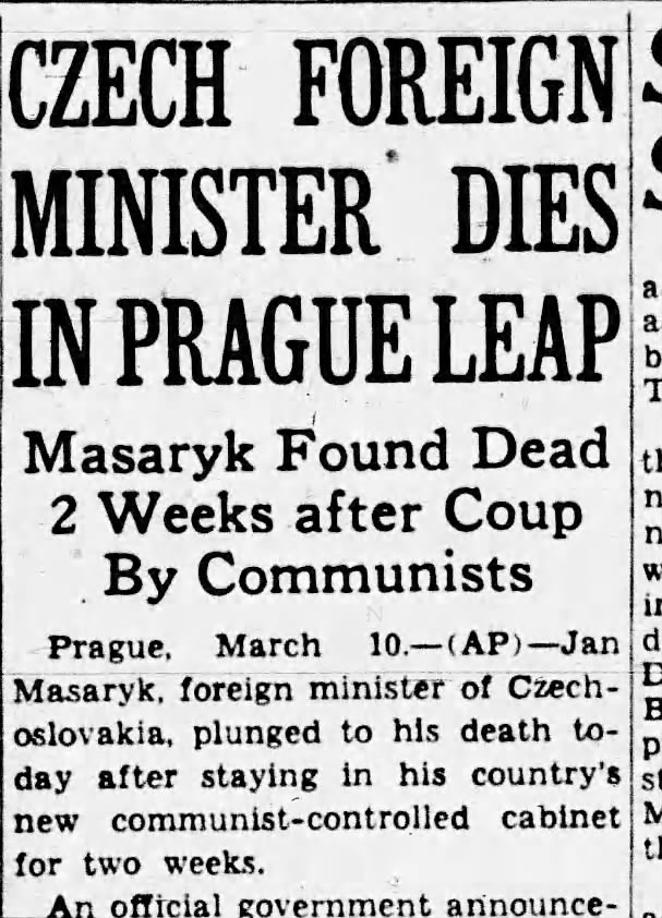 The most famous death during this period was the former Czech foreign minister Jan Masaryk (1886-1948) who fell out of a window in his pyjamas. Suicide? Murder? The jury is still out.